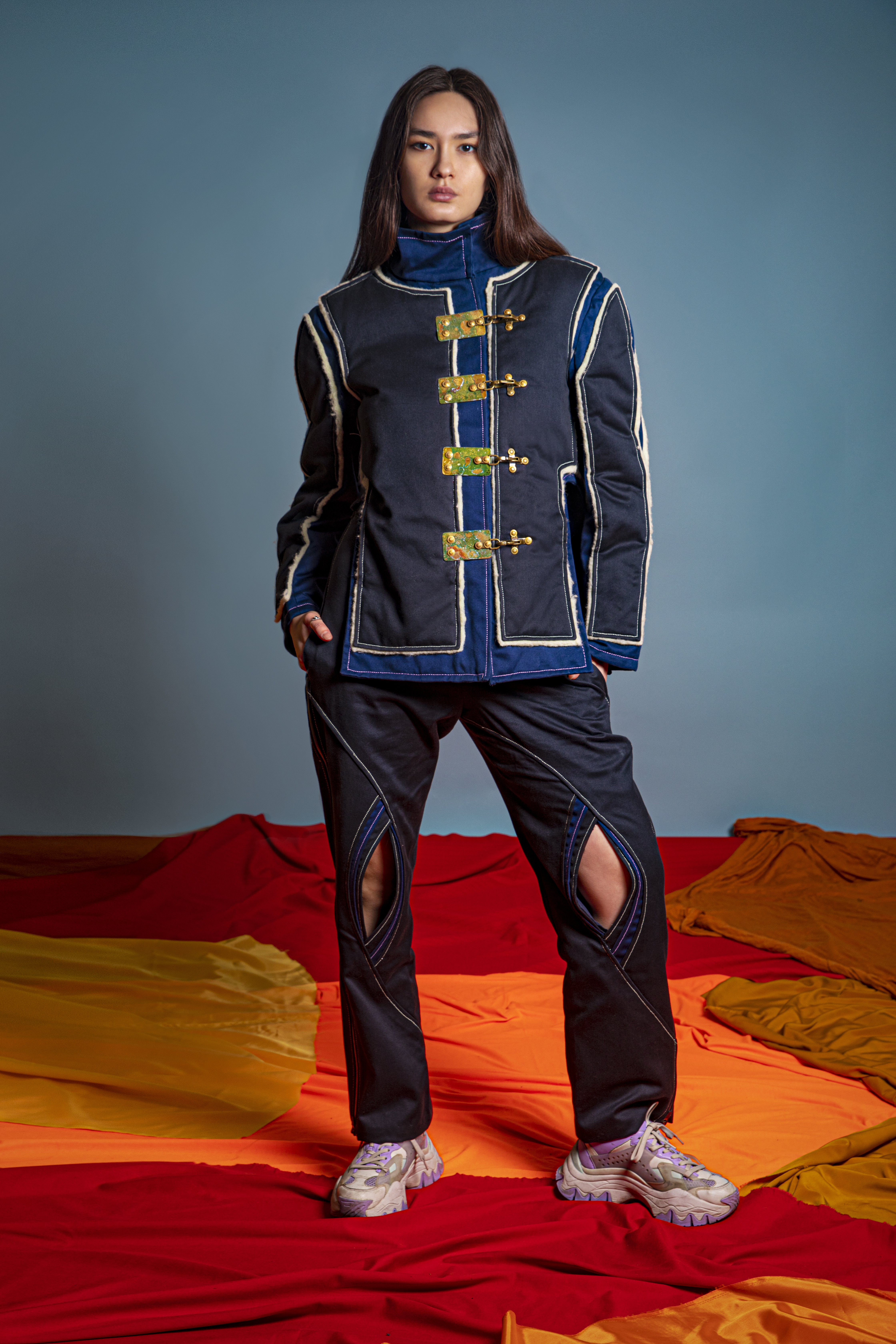 Trousers: made with organic coted linen. Coating: beewax incrusted with natural pigments.